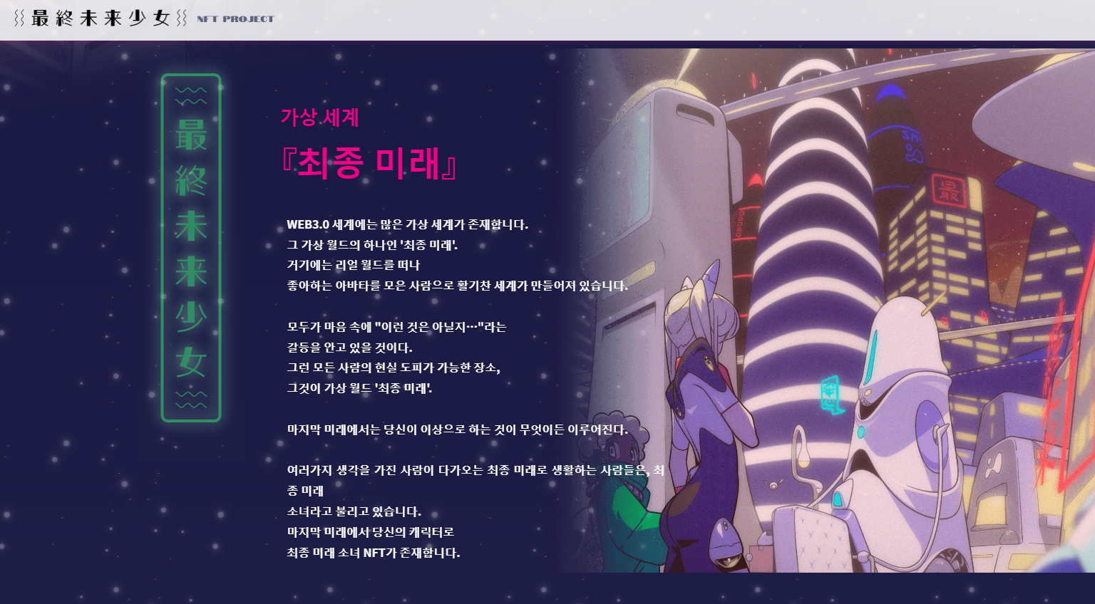- 세계관으로서 최종 미래는, 음악, 예술 및 엔터테인먼트를 통한 블록체인 안의 가상 세계임. 최종미래의 아이돌인 미도리와 나기는 홀더들의 마음을 현실 세계의 어려움으로부터 해방시키도록 안내한다고 함... 홀더들은 미도리와 나기의 기원 이야기를 알아내는 퀘스트(말하자면 채굴활동)를 하면서 "Oshi point"를 획득함.