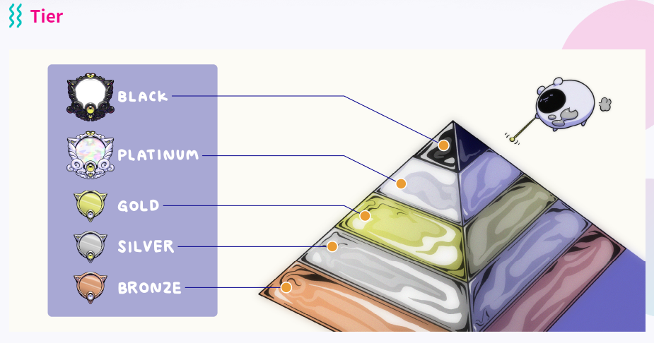 - 블랙부터 브론즈까지 있고 월별 oshi point 합산해서 포인트 높은 순으로 티어가 결정됨(최초에는 모두 브론즈에서 시작).