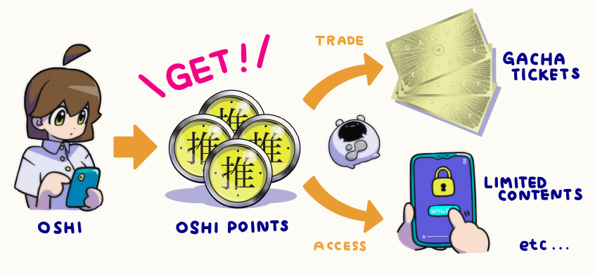 - 트위터에서의 팔로우, 좋아요, 리트윗이나 트위터 외 기타 활동을 통해 oshi point를 쌓으면 이걸로 가챠 티켓이나 독점 컨텐츠를 볼 수 있음. 또한 NFT 등급에 따라서 oshi point 에어드랍도 있을 예정.