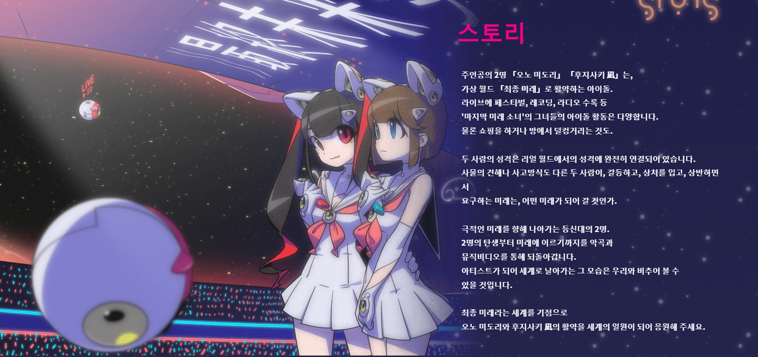- Saishu Mirai Shoujo(최종미래소녀, 이하 SMS) 는 ‘최종 미래’라는 세계관 속 오노 미도리, 후지사기 나기 2명으로 구성된 걸그룹 프로젝트임.